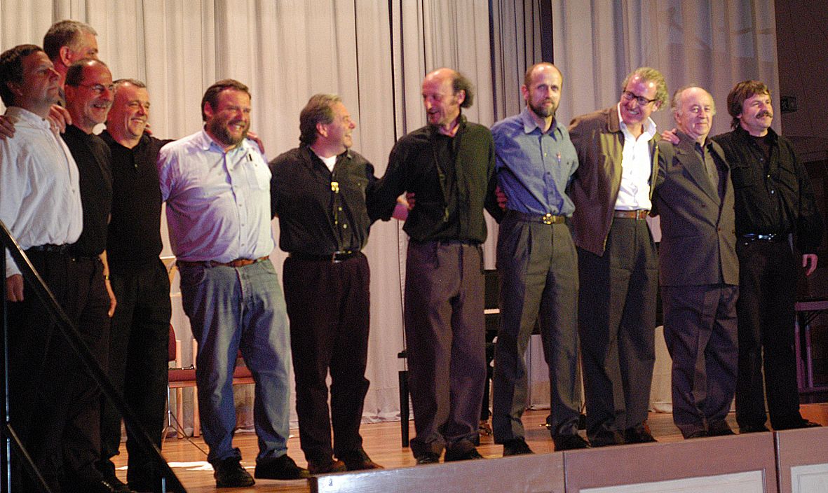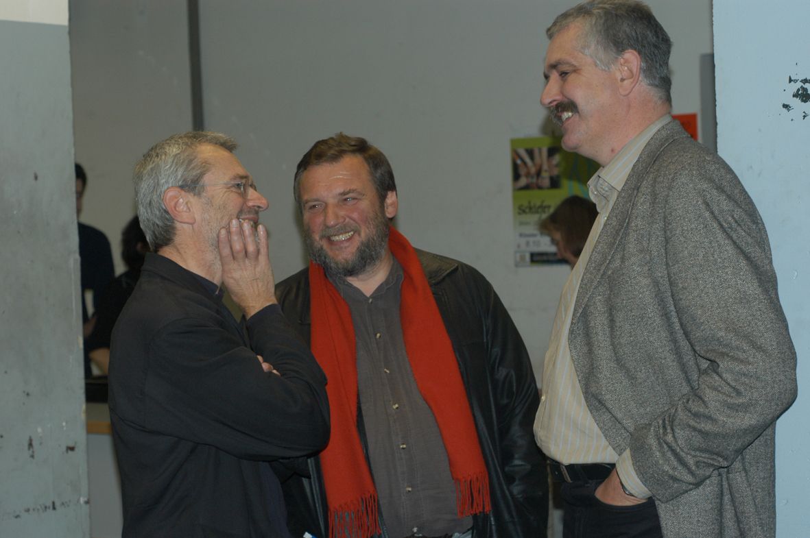 Beim Markt der Kleinverlage im Literaturhaus München 2008 mit Eva Bauernfeind und Hubert Ettl; Hubert Ettl, Harald Grill und Bernhard Setzwein bei einer Benefizveranstaltung 2004; die Akteure der Literaturrevue 2004. (Fotos: Verlagsarchiv)