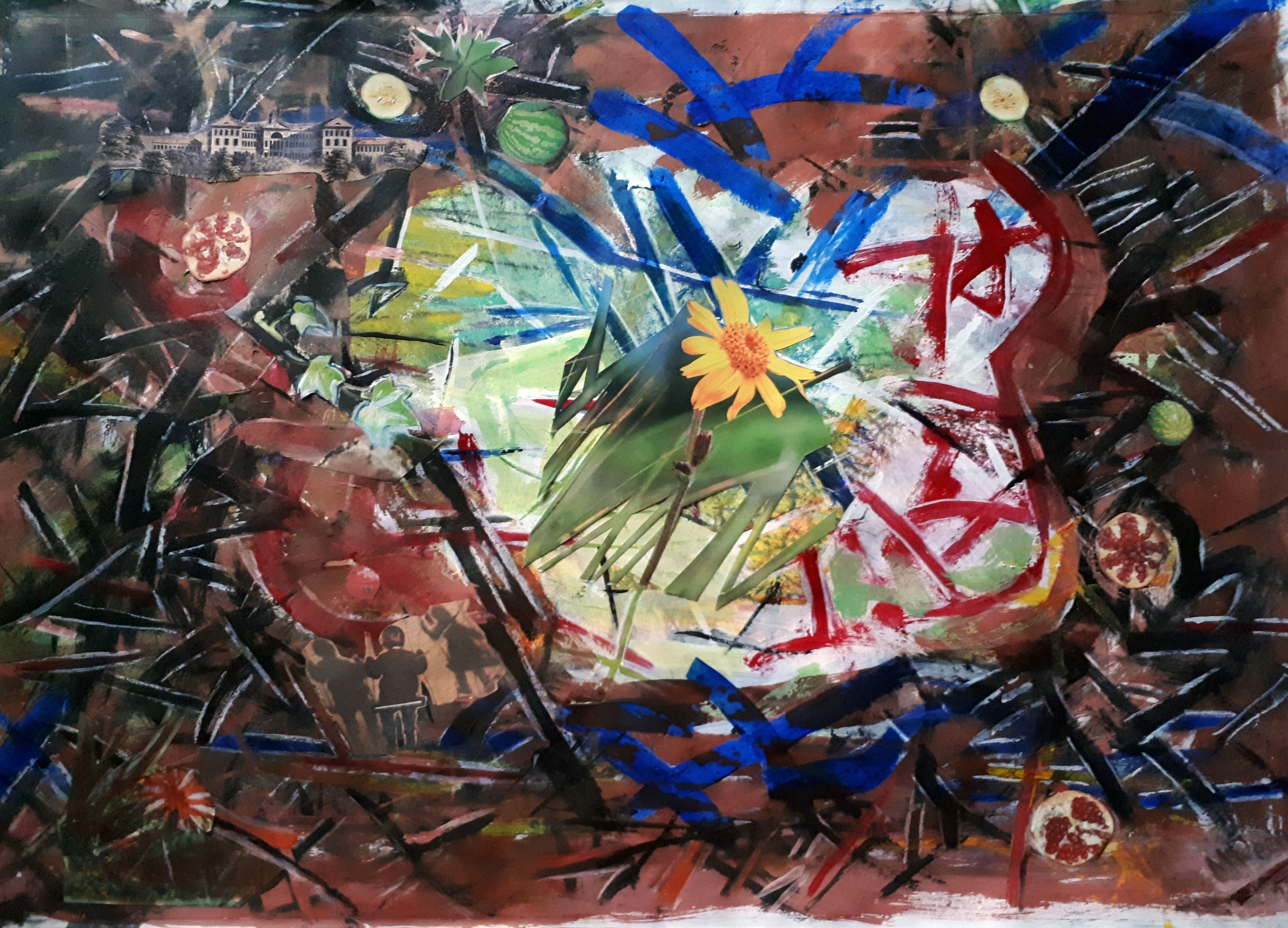 77 x 57 cm (incl. Rahmen), Collage auf Acryl und Tusche, 180 Euro