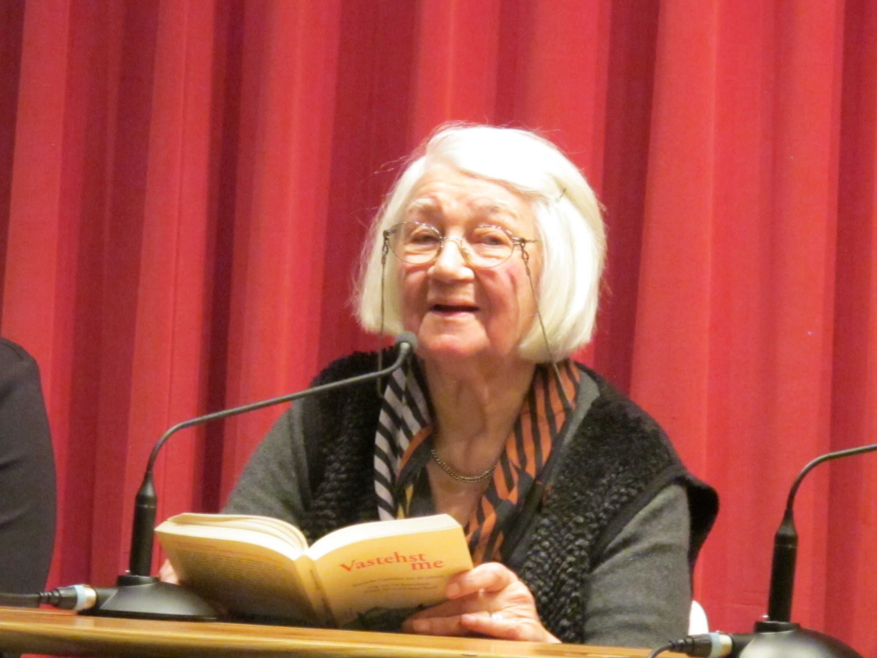 Margret Hölle 2015 mit 88 Jahren bei einer Lesung im Lyrik-Kabinett in München aus der Anthologie "Vastehst me".
