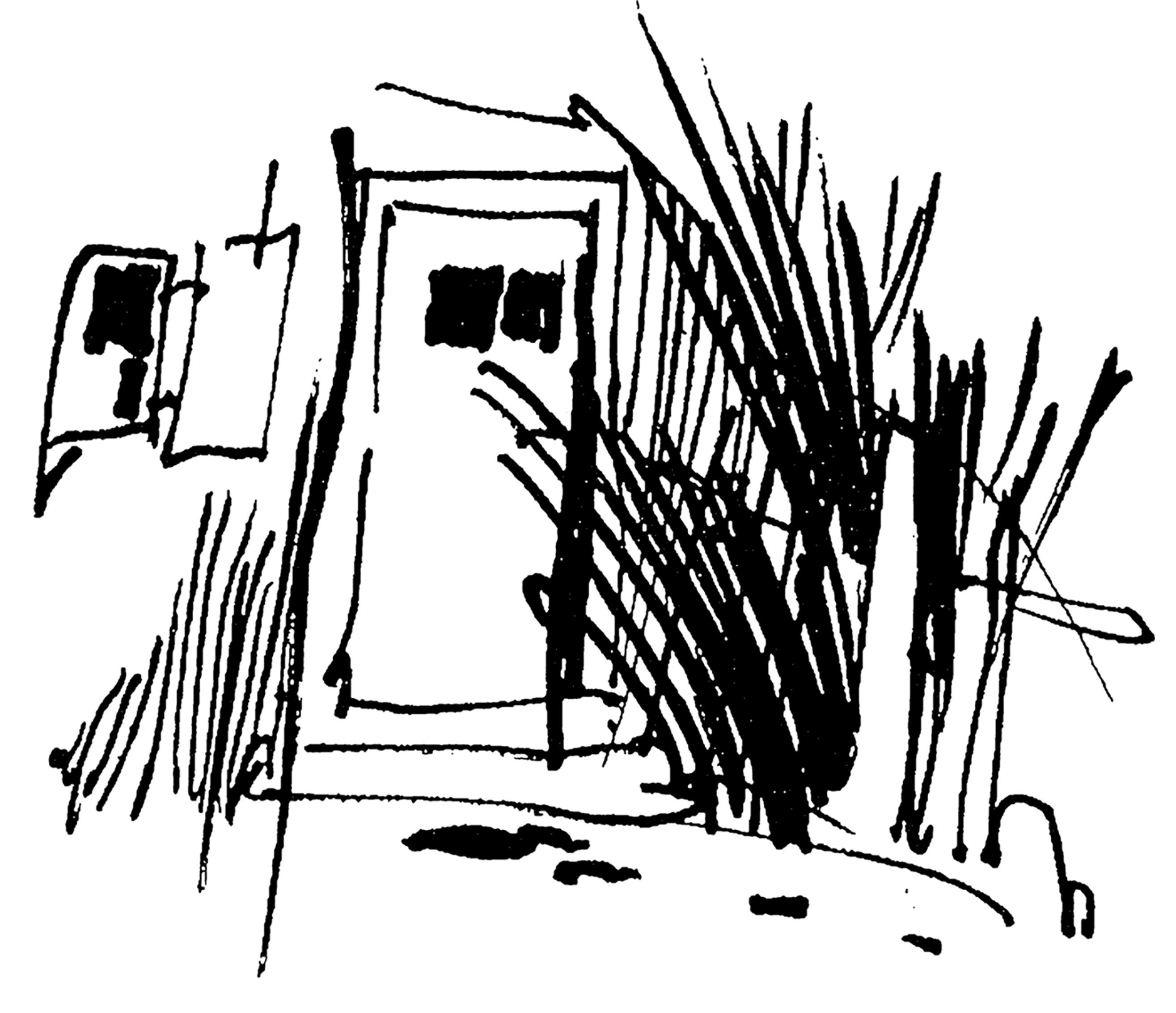 Illustration von Erich Hölle, erstmals veröffentlicht in Margret Hölles Lyrikband "Blöiht a Dornbusch" 1997, nun in der Neuausgabe ihrer Gedichte "Mei Sprouch" (2025).