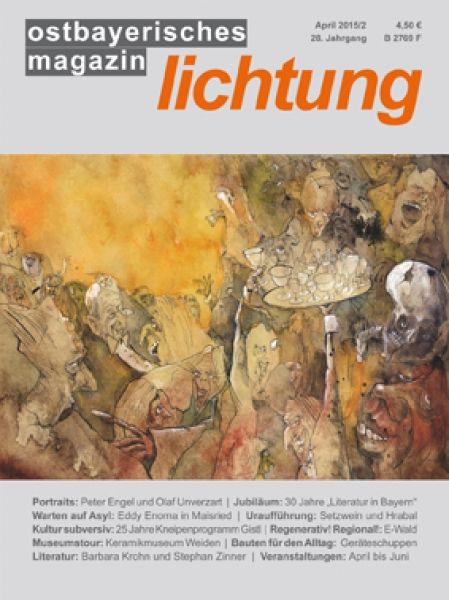 Portraits: Peter Engel und Olaf Unverzart | Jubiläum: 30 Jahre "Literatur in Bayern" | Warten auf Asyl: Eddy Enoma in Maisried | Uraufführung: Setzwein und Hrabal | Kultur subversiv: 25 Jahre Kneipenprogramm Gistl | Regenerativ! Regional! E-Wald | Museumstour: Keramikmuseum Weiden |Bauten für den Alltag: Geräteschuppen | Literatur: Barbara Krohn und Stephan Zinner | Veranstaltungen: April bis Juni