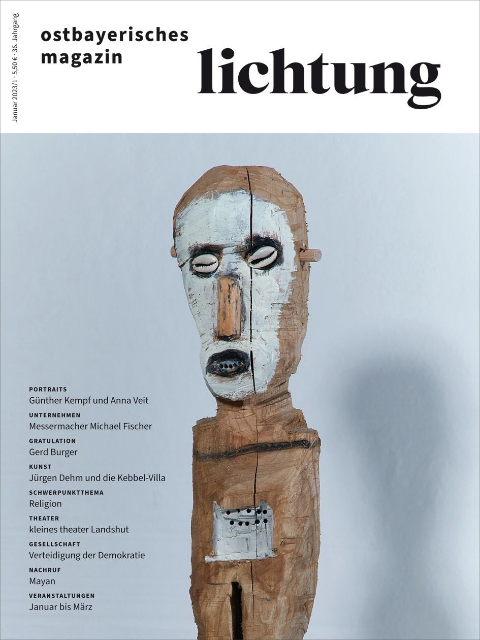 Portraits: Günther Kempf und Anna Veit | Unternehmen: Messermacher Michael Fischer | Gratulation: Gerd Burger | Theater: kleines theater Landshut | Kunst: Jürgen Dehm und die Kebbel-Villa | Schwerpunktthema: Religion | Gesellschaft: Verteidigung der Demokratie | Nachruf: Mayan | Veranstaltungen: Januar bis März